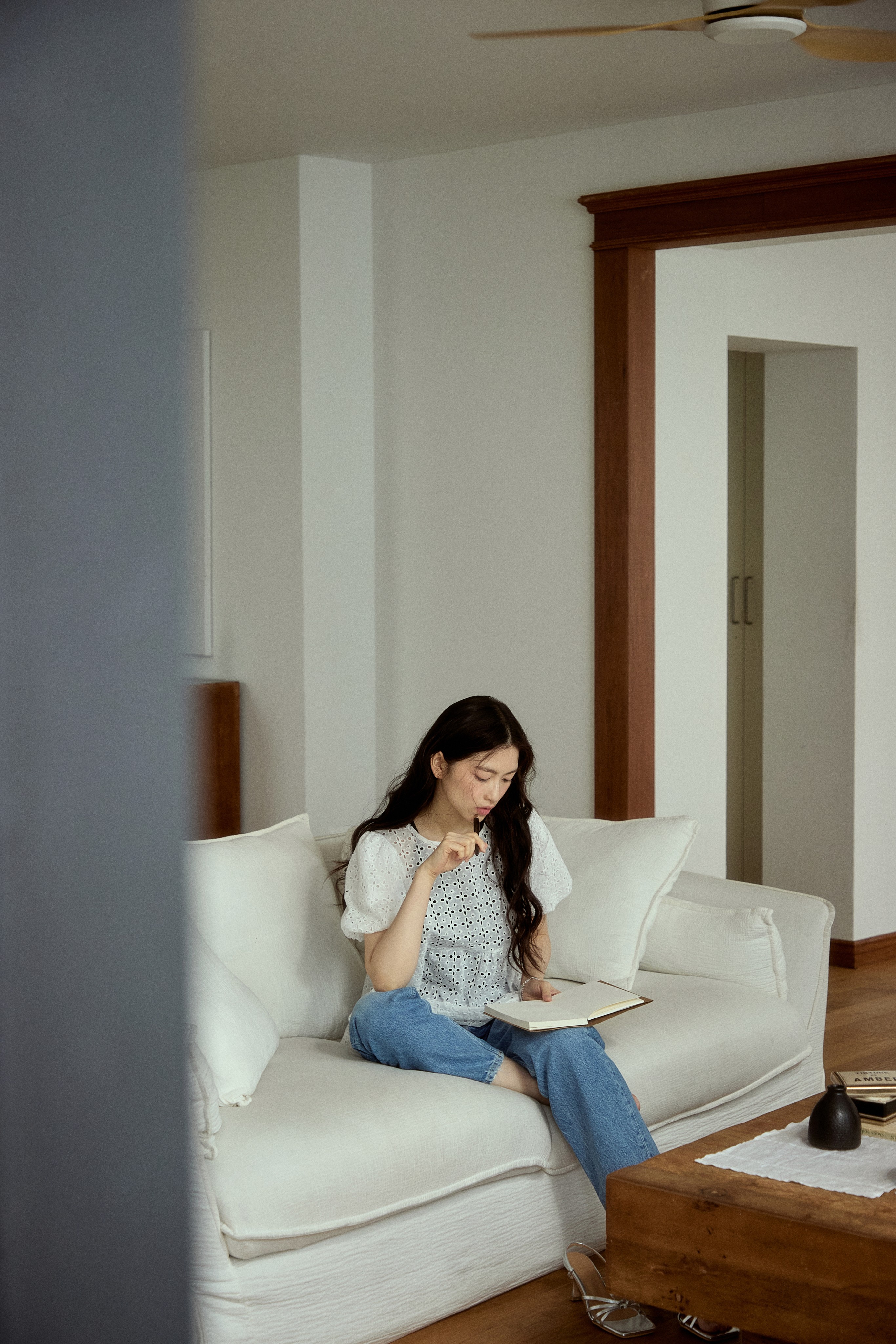 청량한 감각의 펀칭 레이스 블라우스에 블루데님